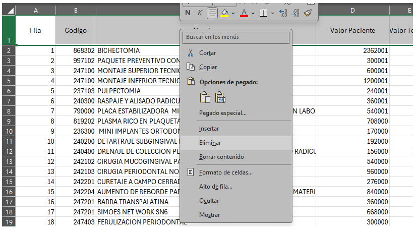 Abrimos el archivo en Excel modificamos los valores que debemos actualizar, recuerda que solo podemos modificar las casillas de Valor Paciente, Valor Tercero, Cantidad Máxima anual, Copago, Inactivo, el campo inactivo el numero 0 significa activo el numero 1 inactivo, luego de modificar y revisar las casillas que necesitamos actualizar con sus valores el siguiente paso es eliminar la primera fila donde están los nombres de las casillas.