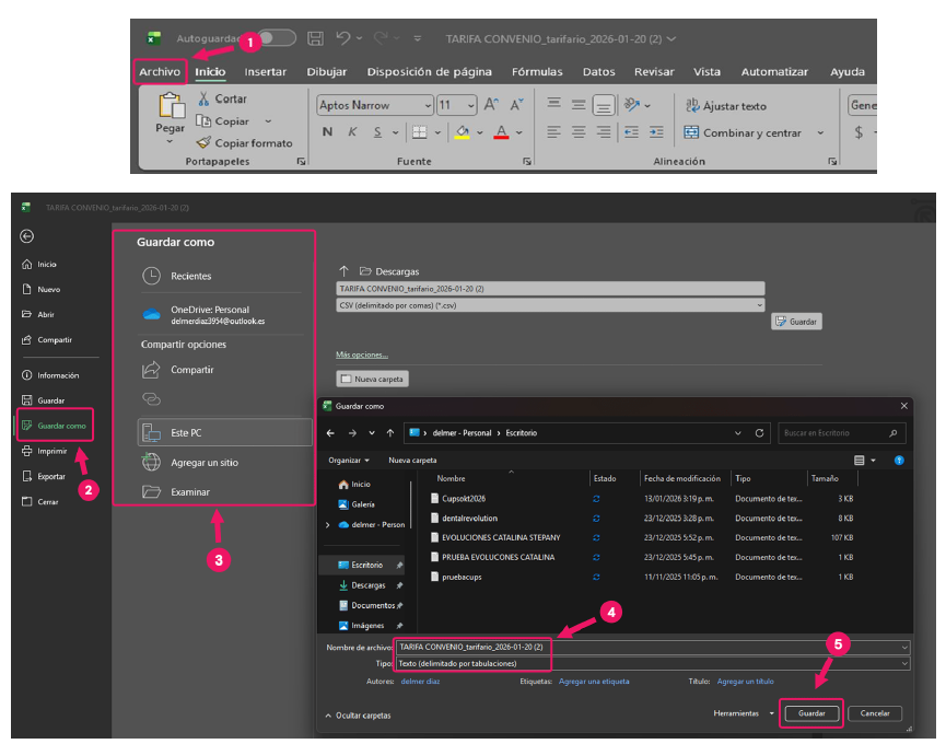 Para guardar el archivo en Excel vamos a darle en archivo luego en guardar como después debes seleccionar la ubicación de donde va a estar guardado el archivo, luego debemos asignarle nombre y la parte mas importante es el tipo de archivo debe ser, Texto (delimitado por tabulaciones)