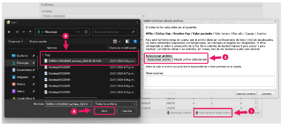 Vamos a volver al tarifario y le vamos a dar en Subir Tarifarios desde archivo, luego vamos a darle en la opción Seleccionar Archivo, buscas el archivo en tu computador le das en Abrir, después de seleccionarlo le damos en Ejecutar cambios.