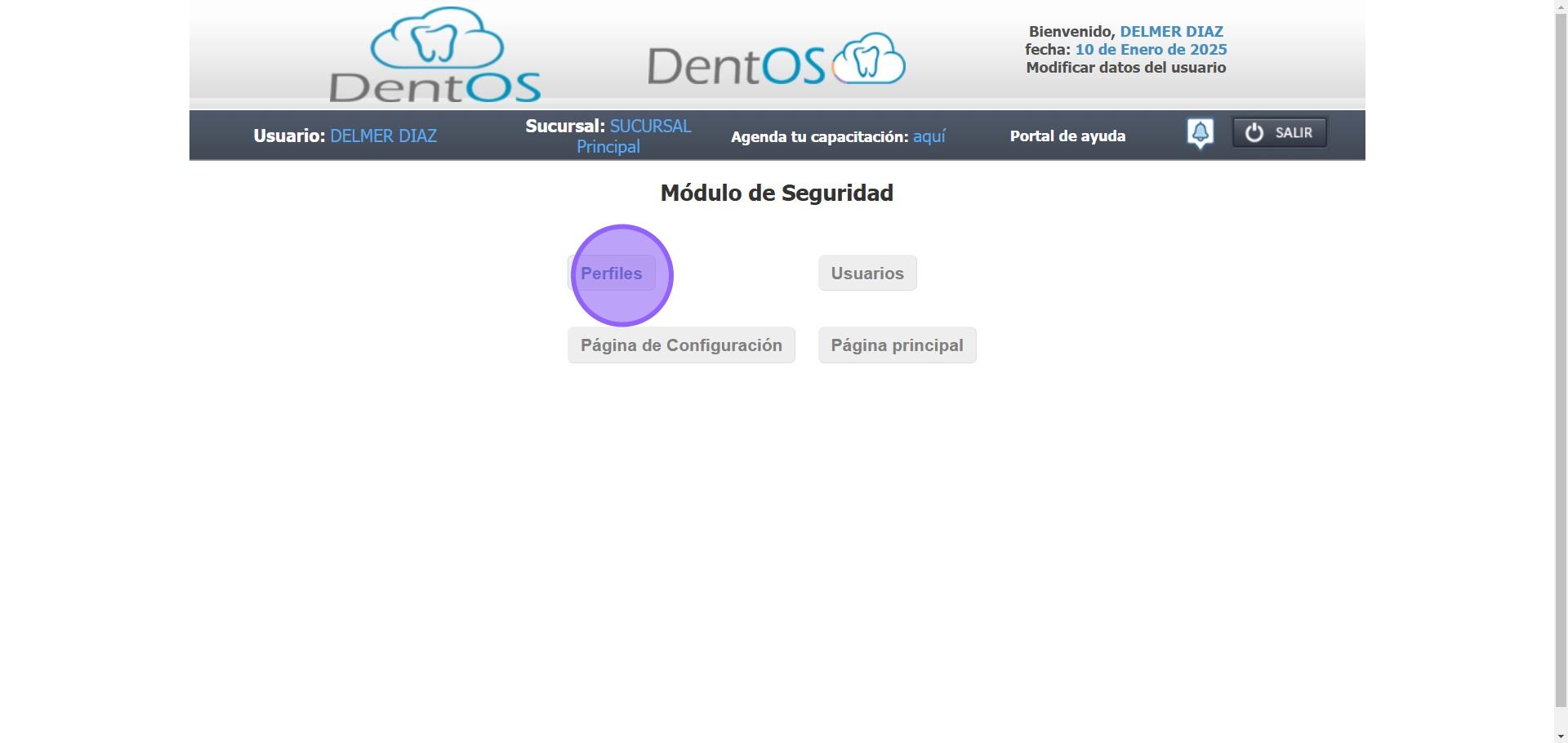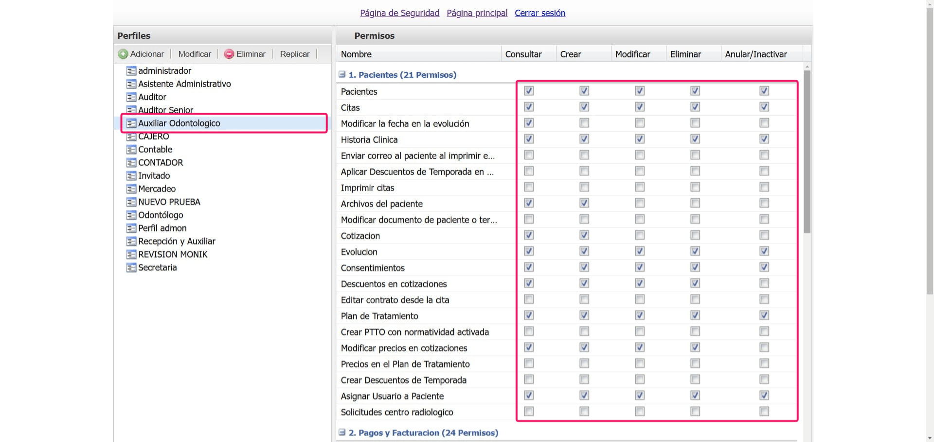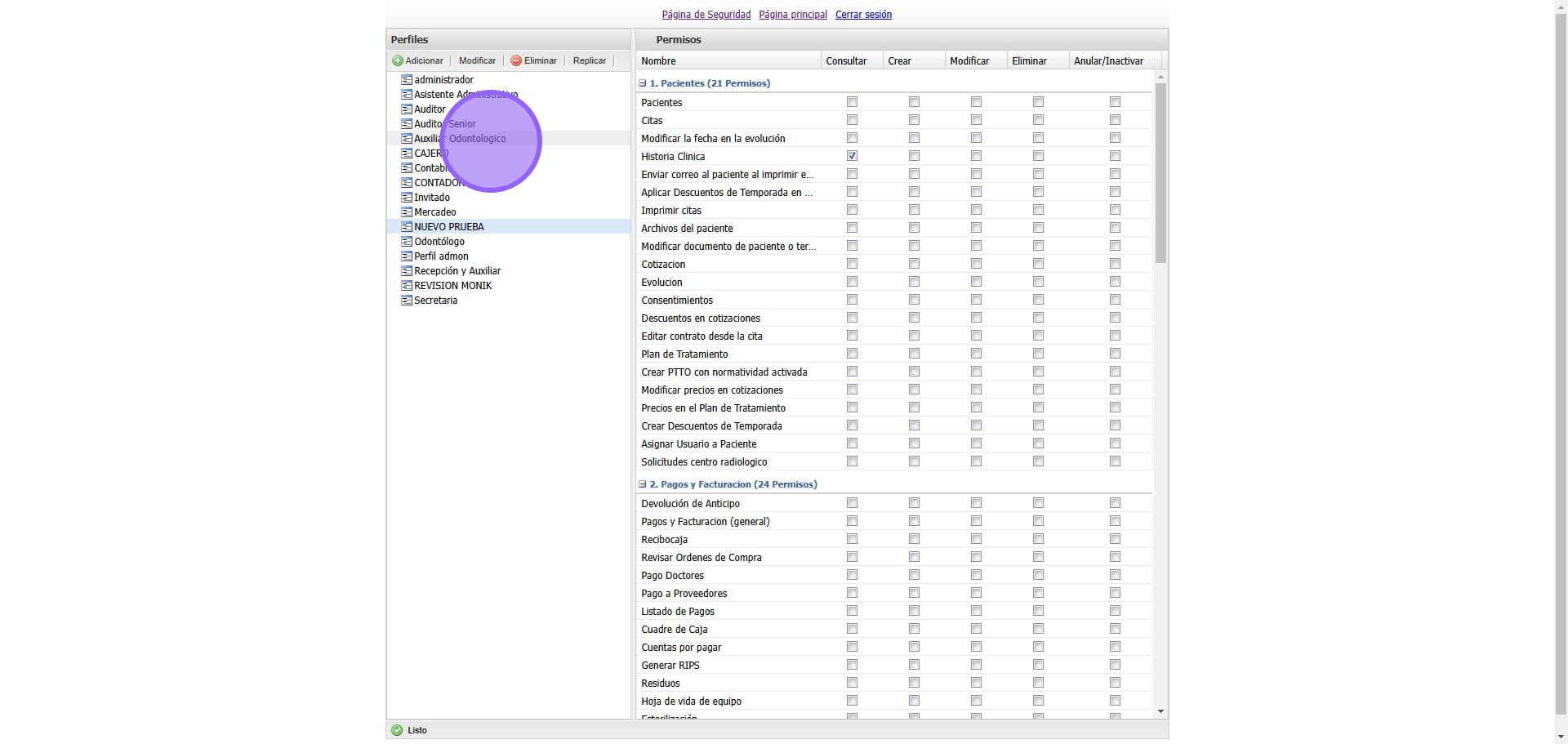Seleccionamos el perfil que deseamos modificar en este caso seleccionamos "Auxiliar Odontológico"