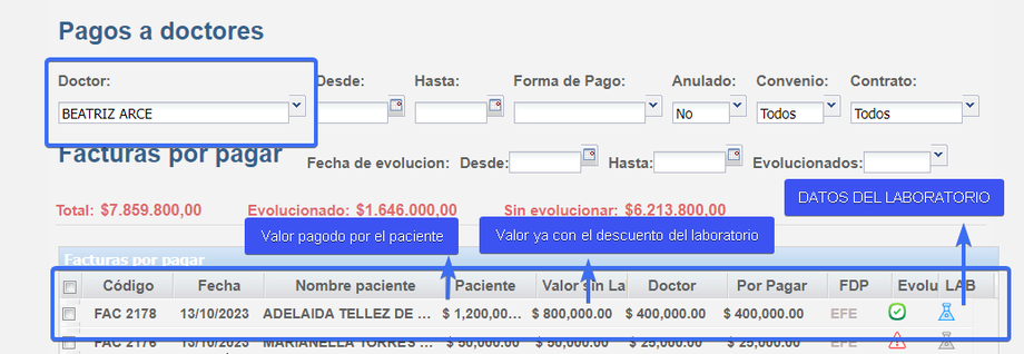 Seleciona el doctor a revisar , en la parte inferior estan los datos del pago del paciente y en el icono azul enuentras la información del laboratorios y los costos y te a la opción de editarla
