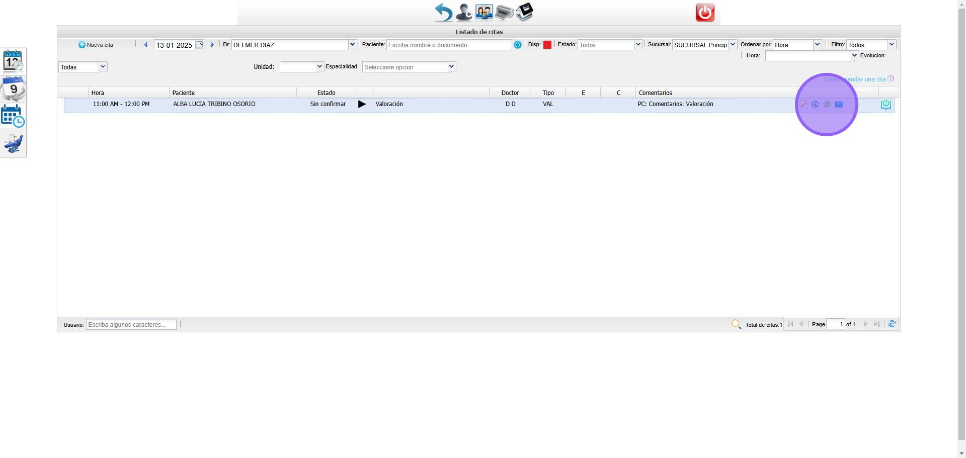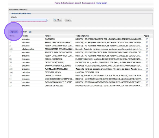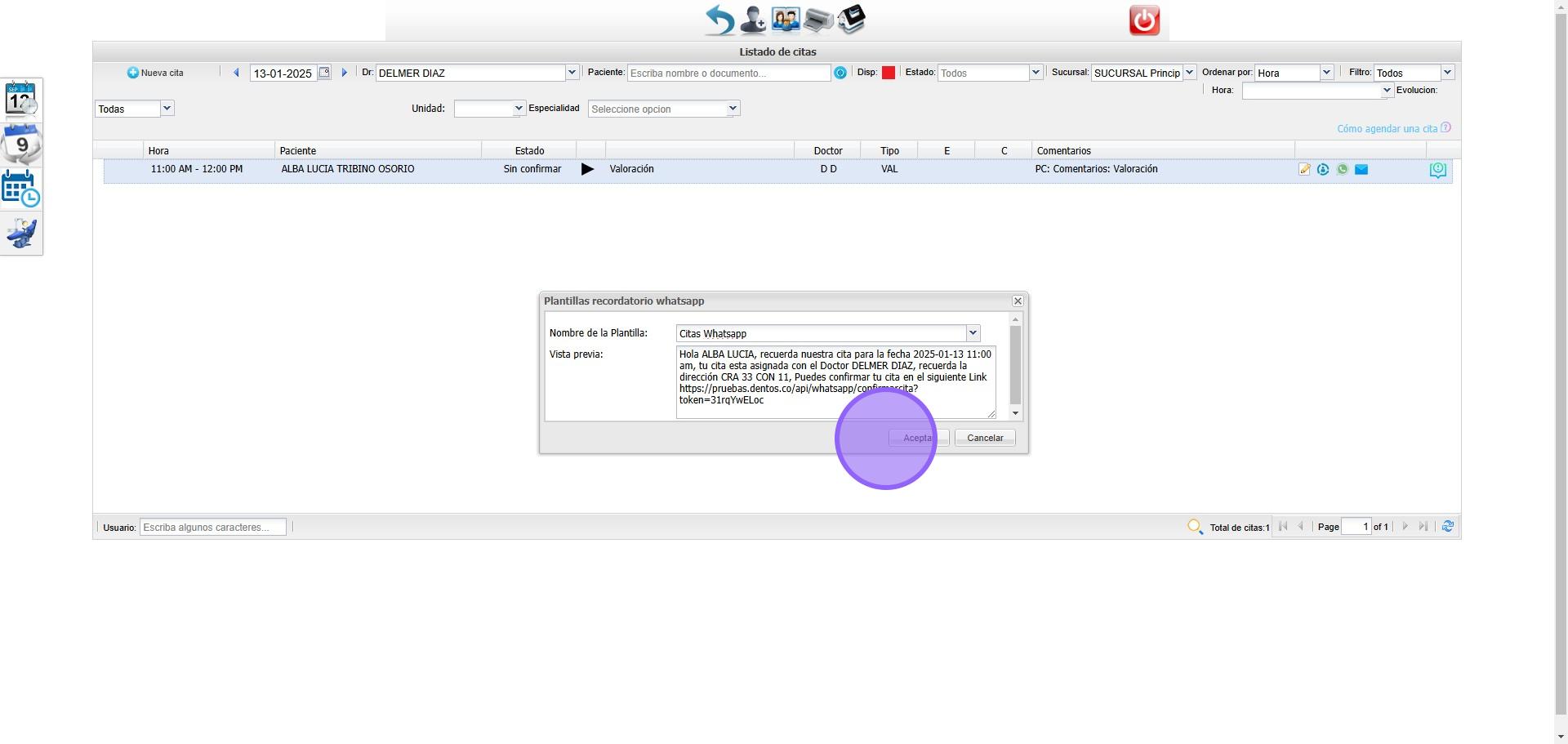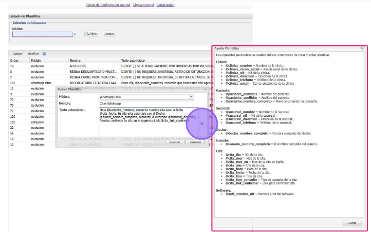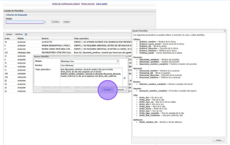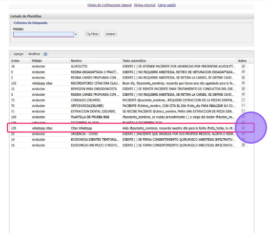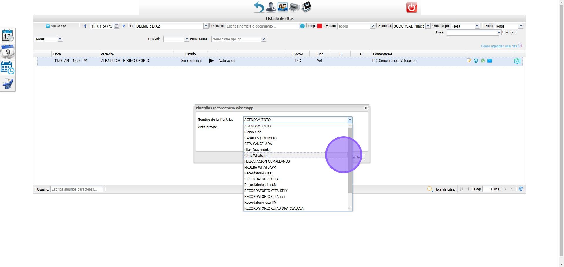 En el modulo de citas seleccionamos el icono de Whatsapp para ingresar en las plantillas