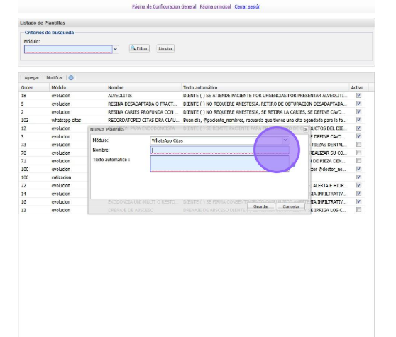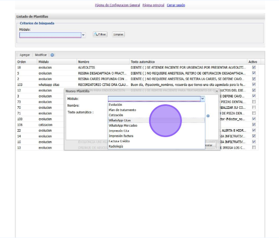 Seleccionamos el modulo donde vamos a visualizar la plantilla en este caso seleccionamos "WhatsApp Citas"