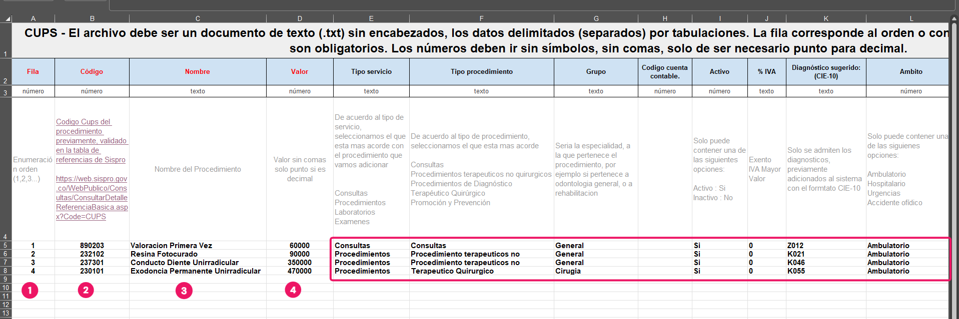 El registro de la información en el archivo donde dice Fila, se debe poner un consecutivo de acuerdo a la cantidad de filas de los procedimientos agregados, el Código, se debe buscar en la tabla de referencias de Sispro y seleccionar el código referente al procedimiento, el Nombre, podemos utilizar el nombre de como conocemos el procedimiento no es necesario como sale en Sispro, Valor, ponemos el valor del procedimiento sin puntos espacios ni comas, los demás datos también son necesarios aunque no obligatorios, recuerda que los Cups deben estar parametrizados de manera correcta para el reporte de los Rips.