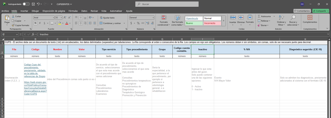 Este es el archivo de Excel donde debemos ingresar la información que vamos a subir al sistema en la Opción de Cups, los campos obligatorios son los que están en rojo.
