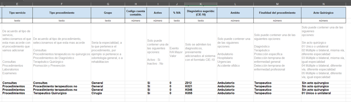 El Tipo de servicio es una segmentación de los procedimientos, los mas comunes son consultas para las valoraciones y citas de primera vez, para los demás generalmente debemos seleccionar Procedimientos, el Tipo de procedimiento es otro filtro con el cual clasificamos los Cups, para las consultas debemos seleccionar Consultas, de acuerdo al tipo de procedimiento los clasificamos de acuerdo al que corresponde si es Procedimiento terapéutico no quirúrgico o Terapéutico quirúrgico. Los demás datos en el archivo de Excel tenemos los ejemplos de los datos que debemos ingresar.