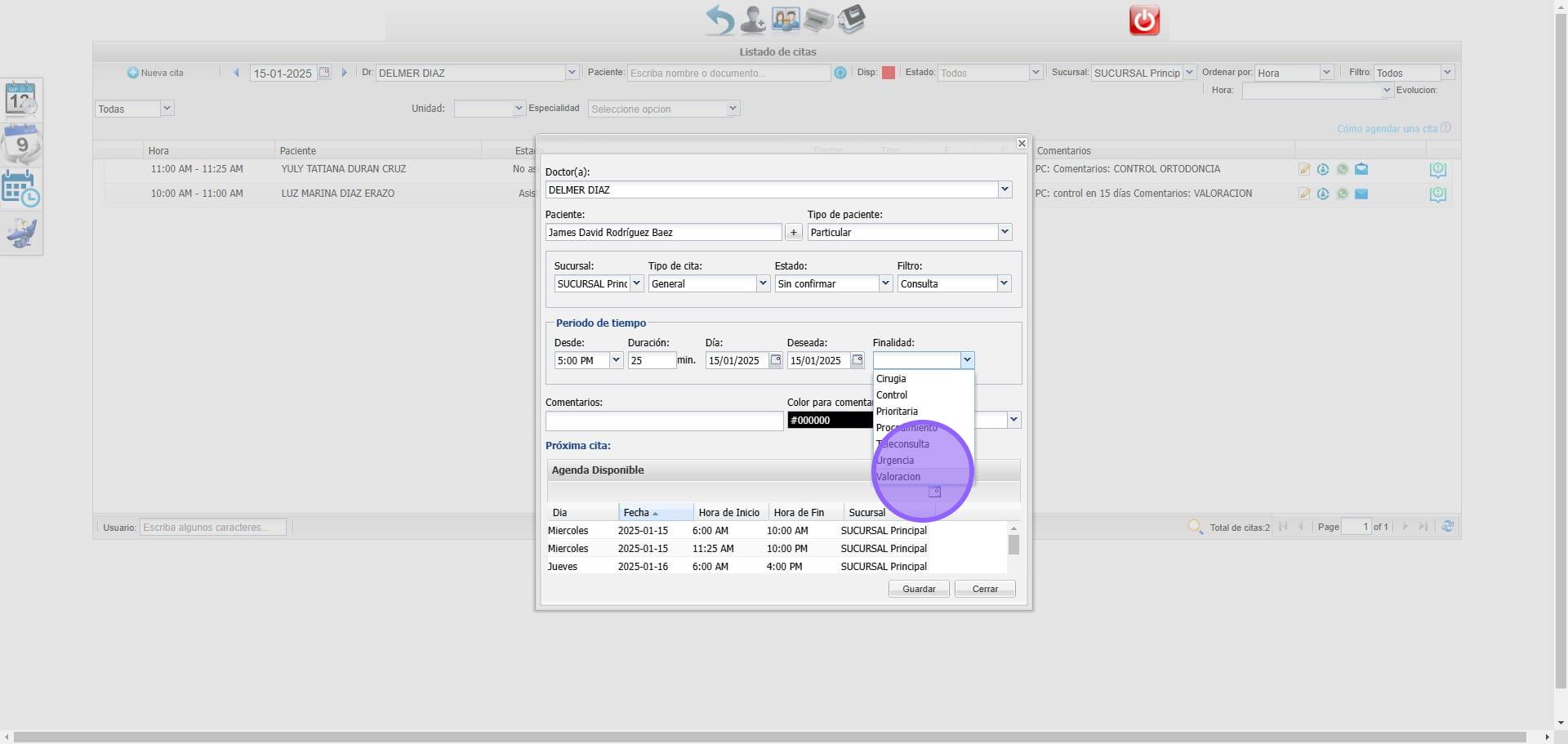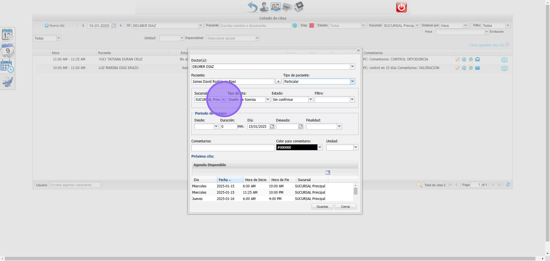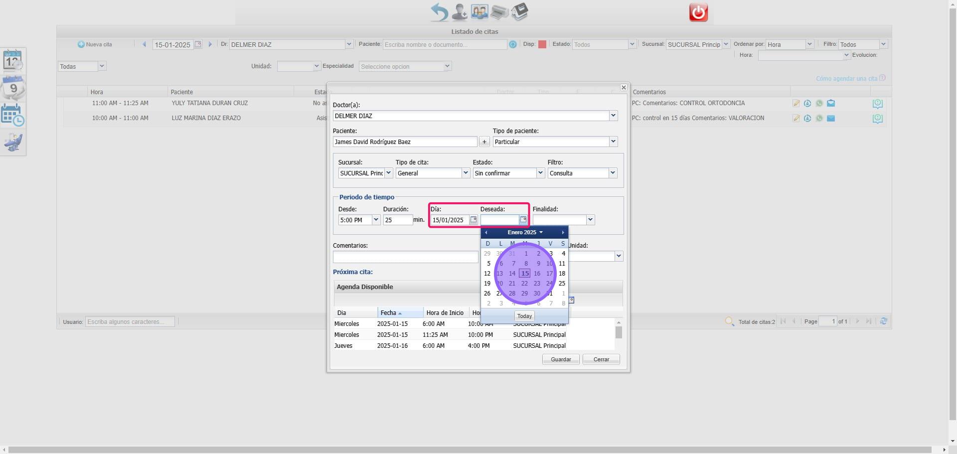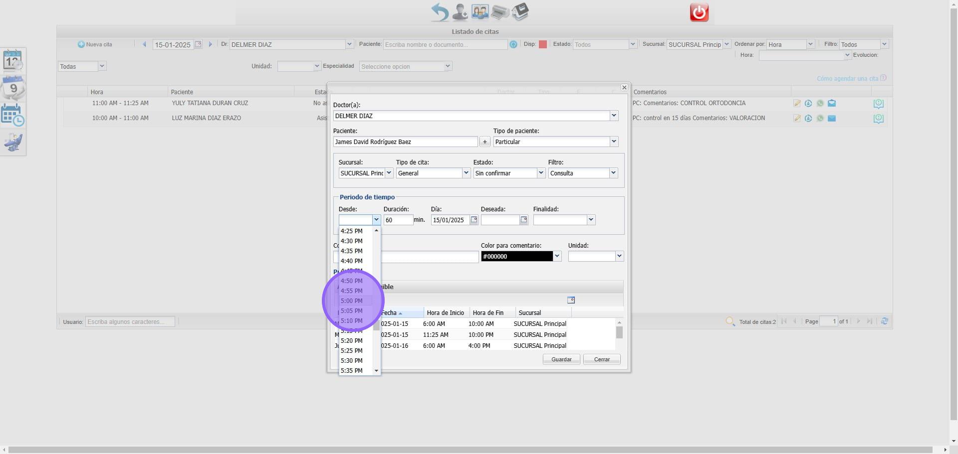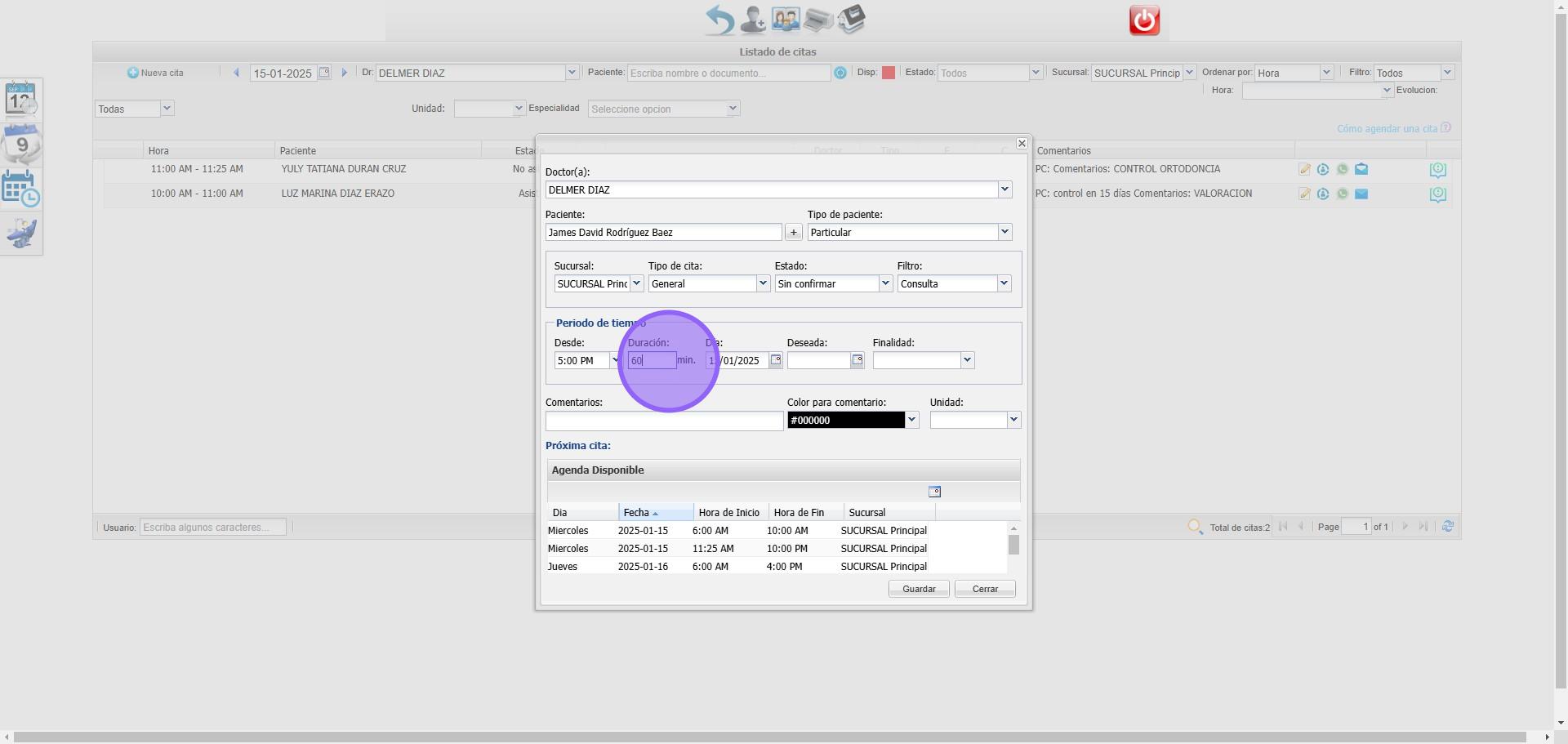 La duración de la cita se establece en minutos también podemos modificarla, (si, tenemos los permisos)