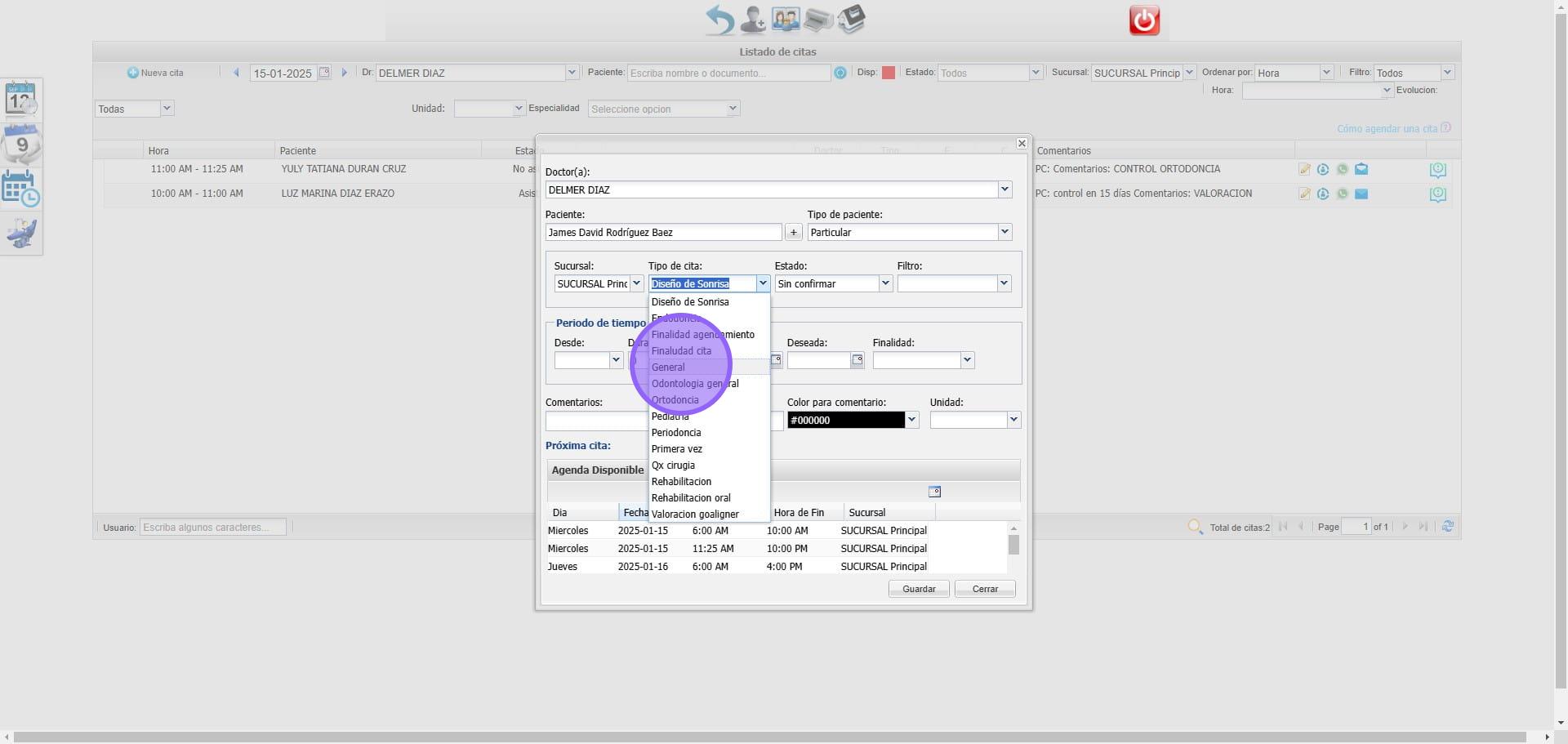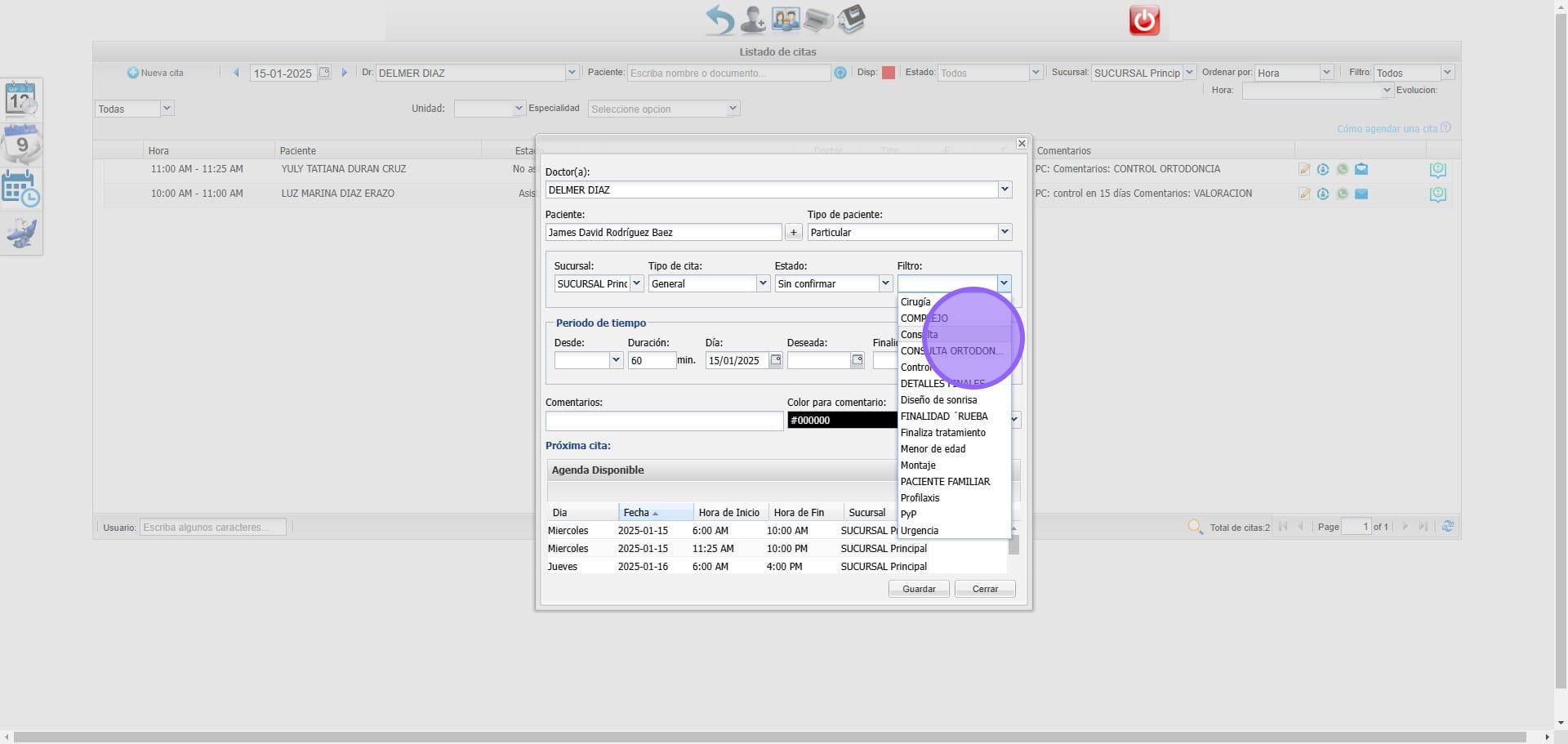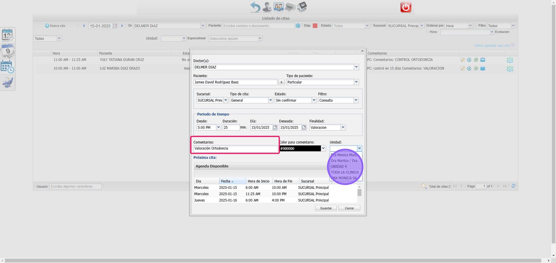 Registramos un comentario para la cita y elegimos la unidad dental de la atención