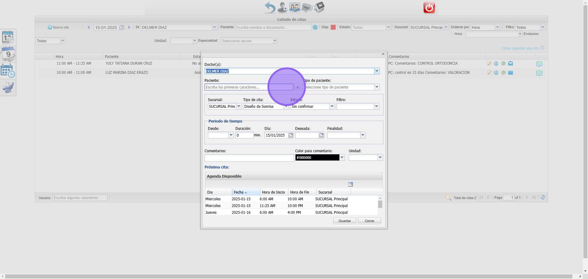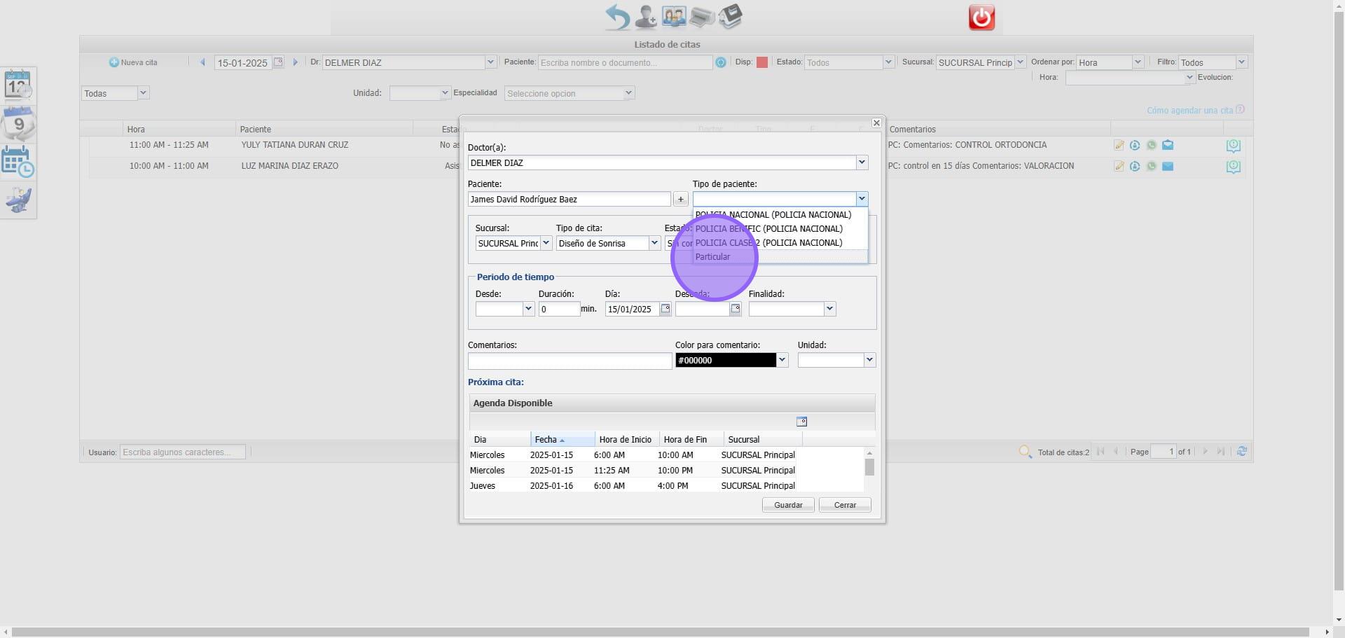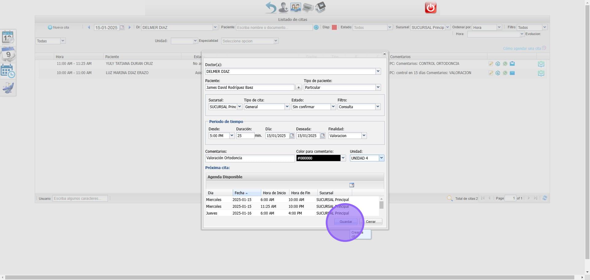 Registramos un comentario para la cita y elegimos la unidad dental de la atención
