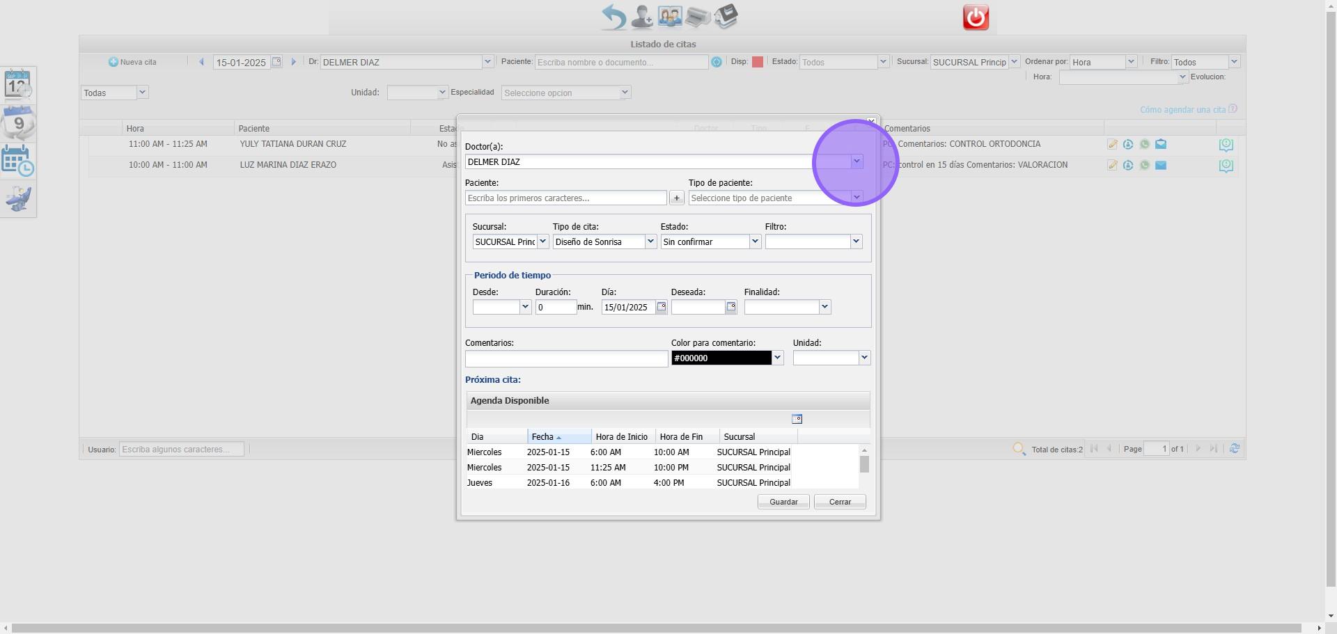 Nos arroja esta ventana donde lo primero que debemos seleccionar, es el Doctor con el cual vamos a asignar la cita