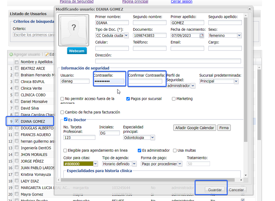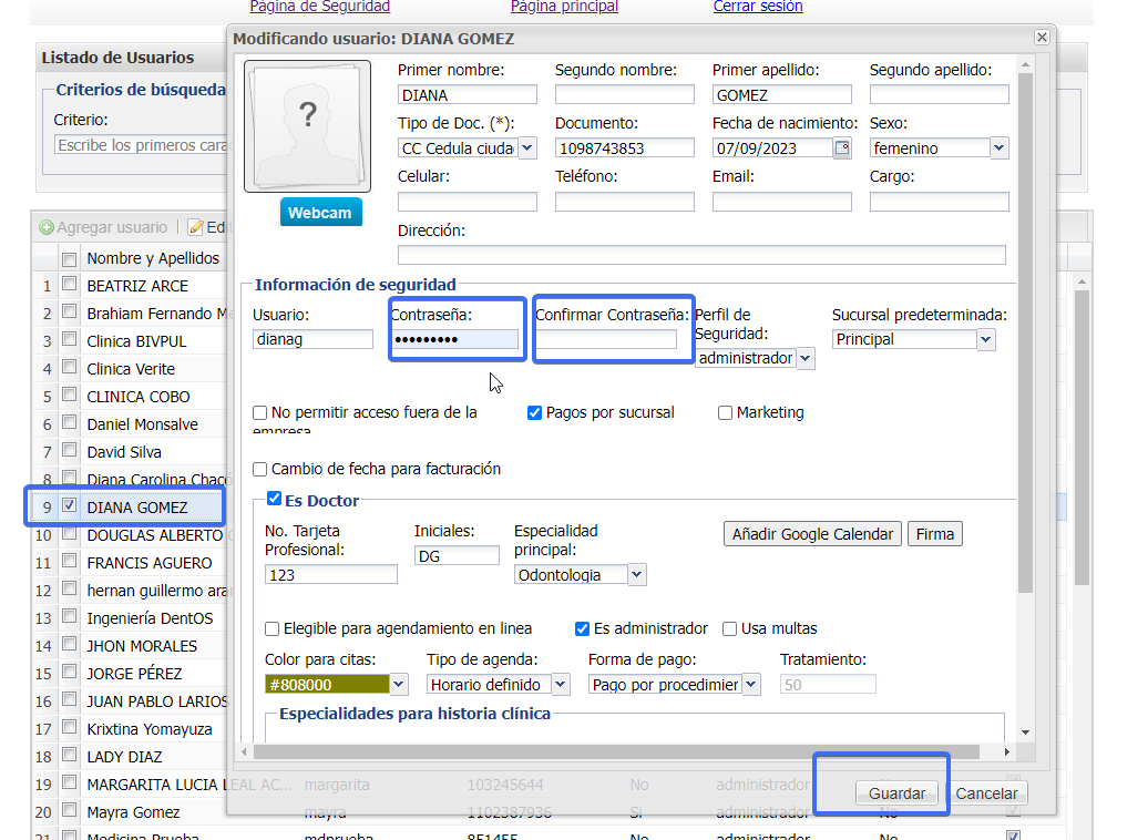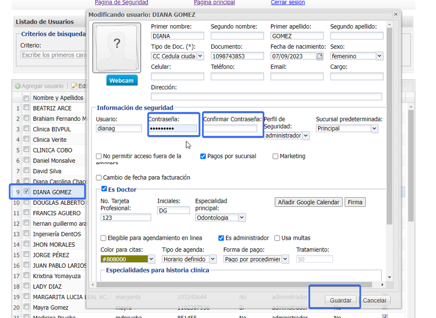 selecciona el usuario que necesitas editar / selecciona el botón: EDITAR USUARIO / se abrirá una ventana con los datos del usuario que necesitar trabajar / realiza el cambio de contraseña y confirma la información / guardar