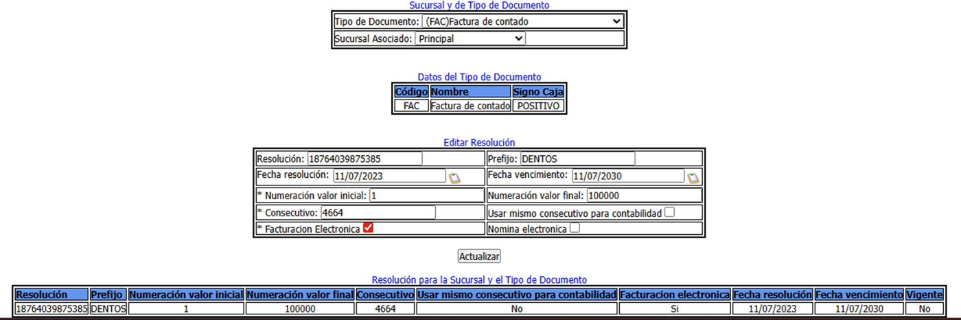 Al darle Actualizar podemos visualizar la información de esta manera, importante que el check que dice facturación electrónica este habilitado de lo contrario la resolución no asocia las facturas electrónicas.