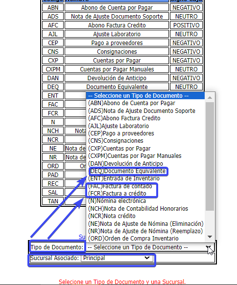 Seleciona la opción tipo de documento: seleciona el formato que deseas parametrizar (factura contado - factura credito - documento equivalente) y la sucursal a la que pertenece en caso de tener sucursales asociadas.