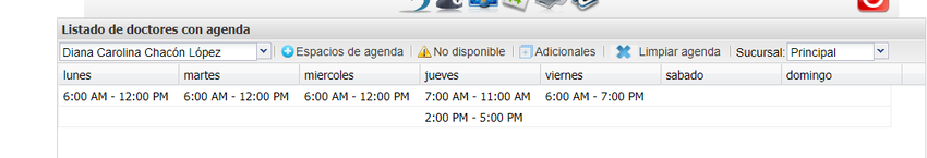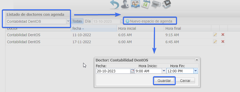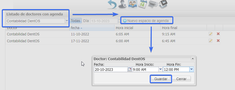 Seleciona al doctor que necesitas programar y das clic en el botón NUEVO ESPACIO EN AGENDA , se abrira una ventana pequeña para agregar el fecha exacta y el horario exacto de asistencia del profesional