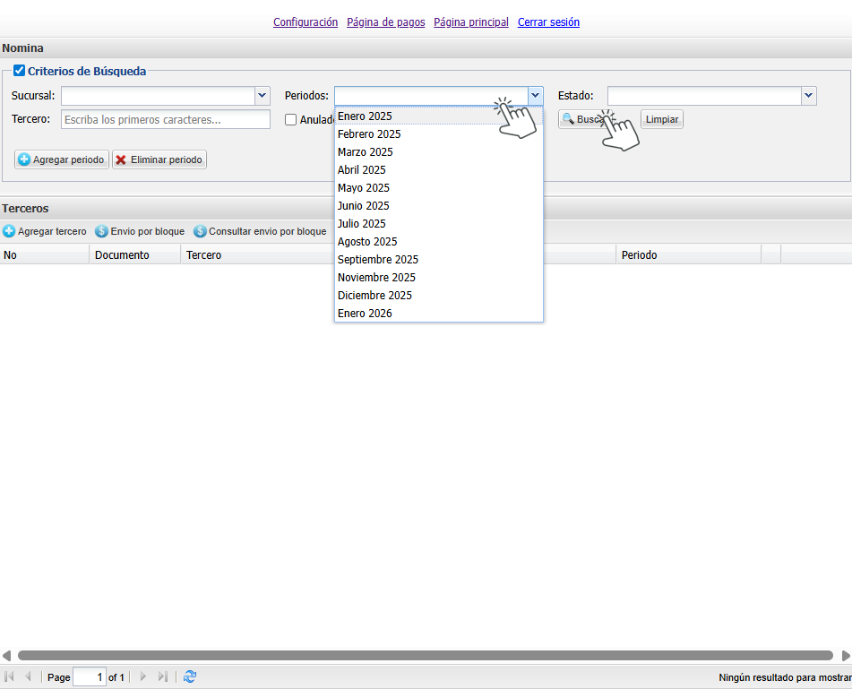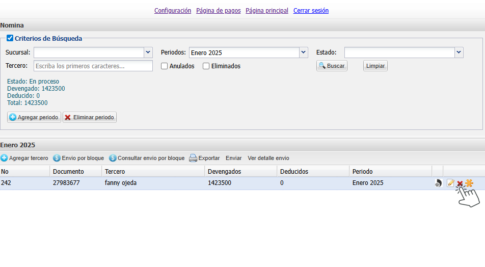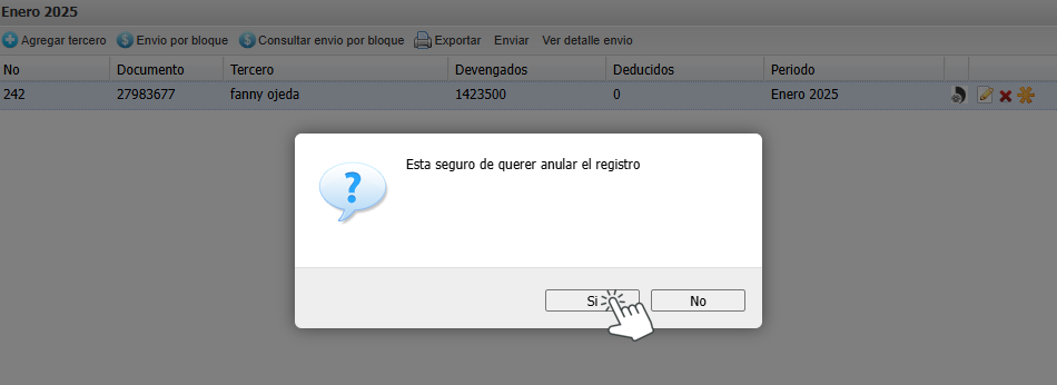 Una vez escogido el periodo que vamos a trabajar, identificamos el tercero al cual queremos anularle el registro y oprimimos la equis de color rojo.