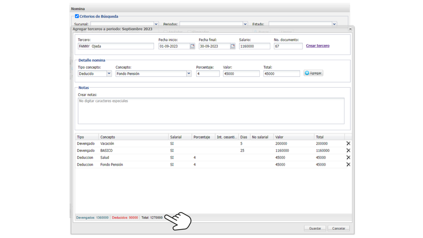Ahora es momento de agregar tus devengados y deducidos los cuales puedes seleccionar desde tipo de concepto, dependiendo de si es devengado o deducido te habilitará los conceptos y por ultimo debes digitar días, porcentaje (opcional) y valor.