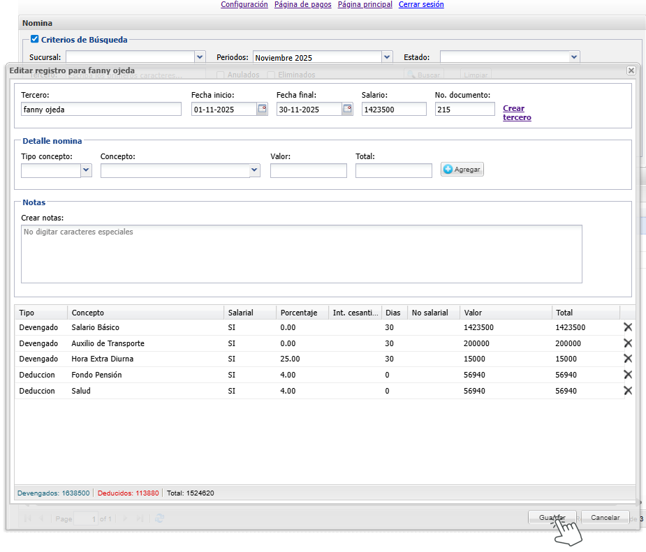 Una vez realizado los cambios necesarios en la nomina del tercero (quitar algún concepto, agregarlo, editarlo etc…), guardamos en el botón de la parte inferior derecha