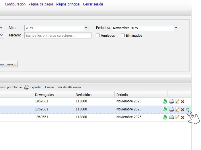 Escogemos el periodo a buscar, revisamos el enviado por medio del Logo de la DIAN, el cual, debe estar en color verde, posteriormente, editamos la nomina del tercero de manera normal en el icono de modificar.