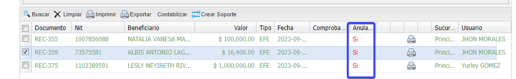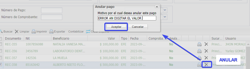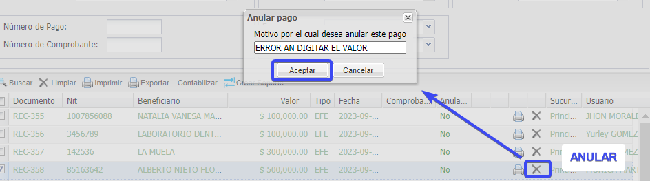 Seleciona el documento, clic en la X se abria una ventana pequeña donde debes describir por que se genera la anulación y clic en ACEPTAR