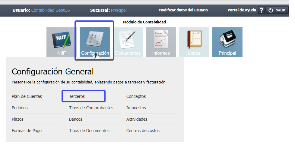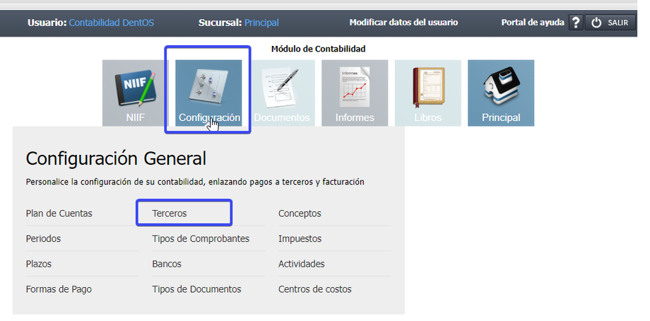 En la página principal, vamos a ingresar al módulo de Contabilidad (icono de la calculadora) /configuracion /terceros