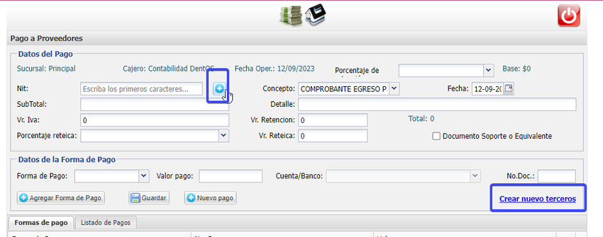 Se abrirá un formato para crear comprobantes de egreso y tendrá disponibles 2 opciones para crear terceros