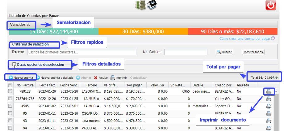 En esta sección puedes crear todos las cuentas y facturas pendientes de pago sin importar el tipo de gasto o proveedor , eso permite llevar semaforización de la cuenta proximas a vencer a 30 . 60 y 90 dias igual de los saldos totales y pariciales que se deben para tener el control de los proximos gastos.