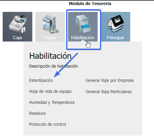 Seleccione la sección HABILITACION y luego la opción ESTERILIZACION