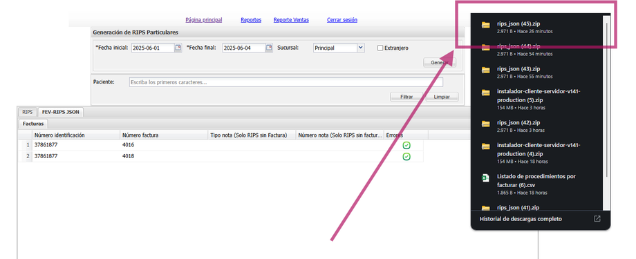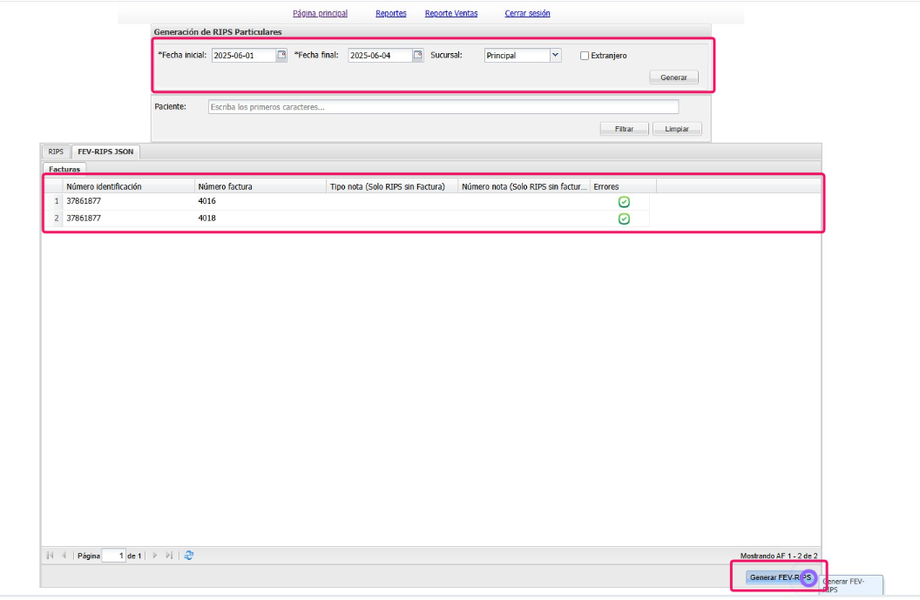 1. Inicialmente debemos descargar los Rips, debemos parametrizar el rango de fechas y revisar que no tenga errores luego debemos presionar en la parte inferior en el botón Generar Fev - Rips