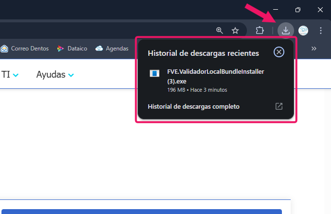 En la parte derecha donde se muestran las descargas vamos a visualizar este archivo el cual es el instalados de la versión mas reciente del validador simplemente debemos darle Clic.