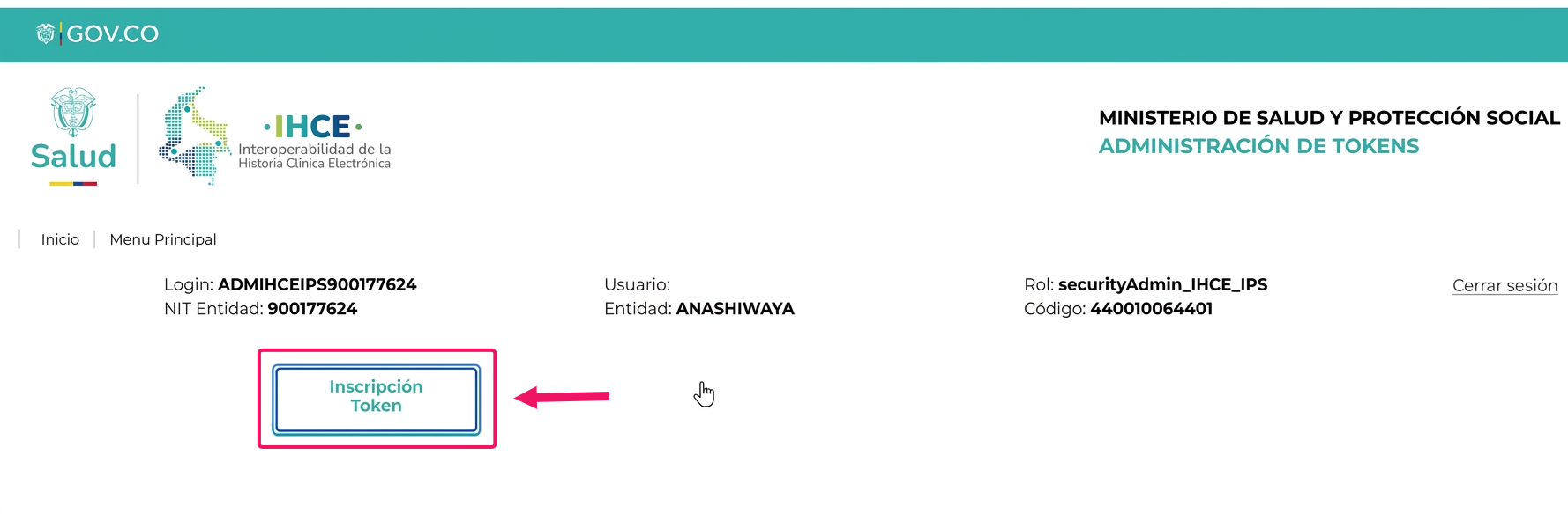 📍 Una vez ingresamos, seleccionamos la opción Inscripción de Token 🎟️