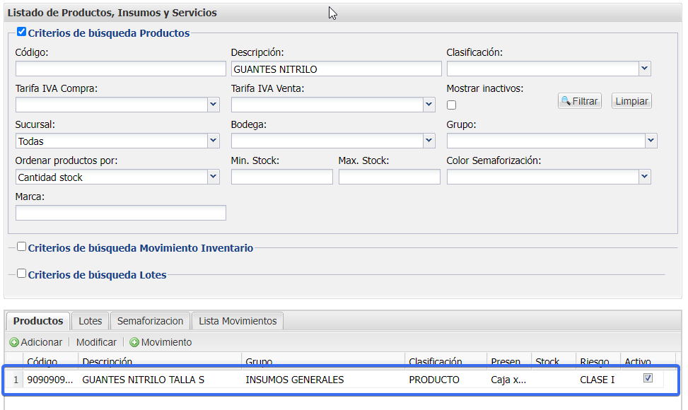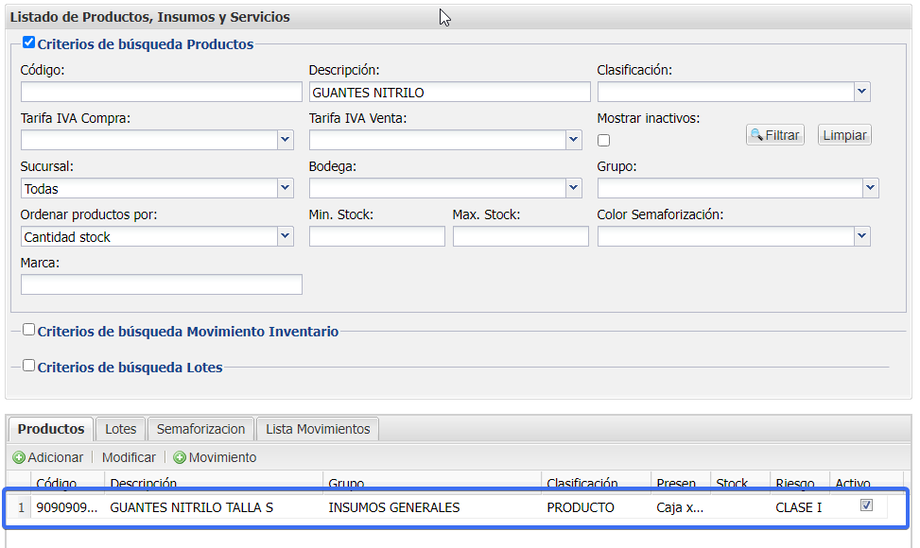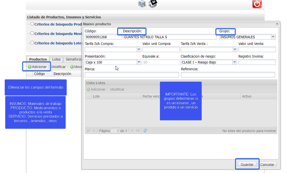 Damos clic en el botón Agregar ubicado en la parte izquierda, diligencias la información del nuevo producto o insumo y dar clic en el botón Guardar .