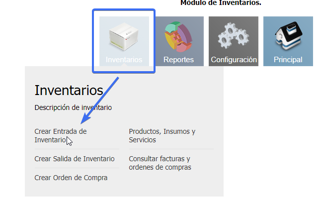 Selecciona la sección INVENTARIO y toma la opción CREAR ENTRADA DE INVENTARIO