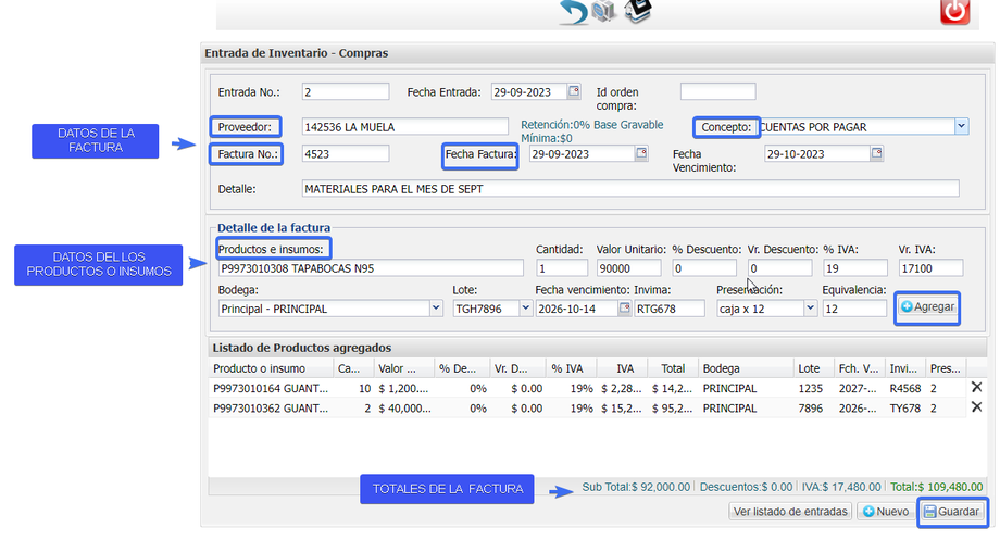 CREAR ENTRADA DE INVENTARIO se usa para ingrasar productos desde una factura de compra a un tercero o proveedor con todos los detalles.