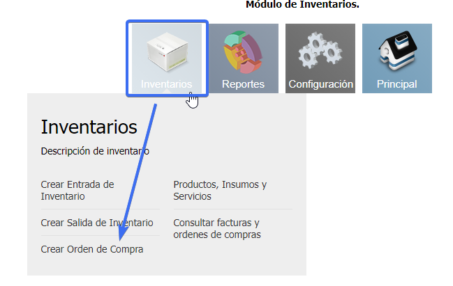 Selecciona la sección INVENTARIO y toma la opción CREAR ORDEN DE COMPRA