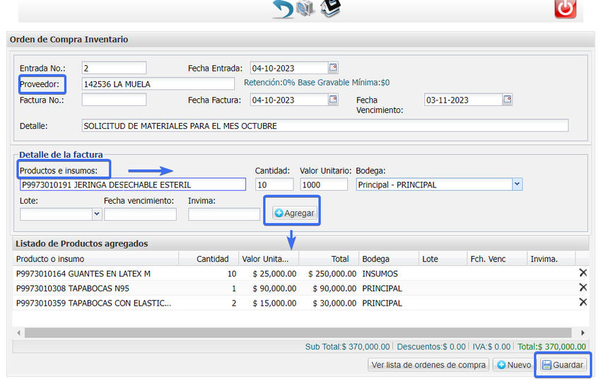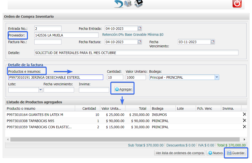 Se abrirá el formato en el que se deben diligenciar los campos, proveedor y registrar los productos con las cantidades a solicitar el precio promedio de compra, una vez creada la lista haga clic en GUARDAR .