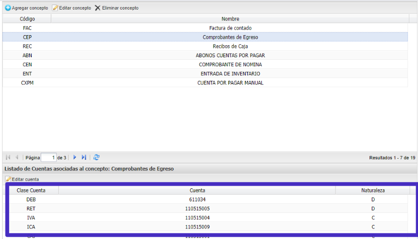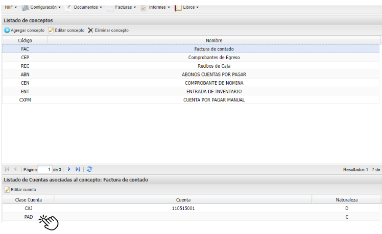 En esta sección encontraras todos los conceptos los cuales deberas ir uno a uno haciendo clic y agregando cuentas contables en la parte inferior