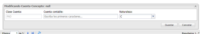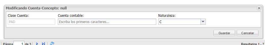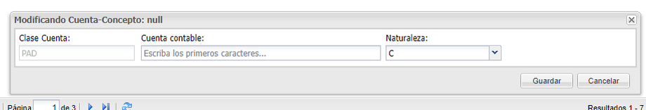 Te aparecera la siguiente ventana que deberás diligenciar la cuenta contable que debe estar creada previamente en el PUC y la naturaleza de la misma para el tipo de concepto.