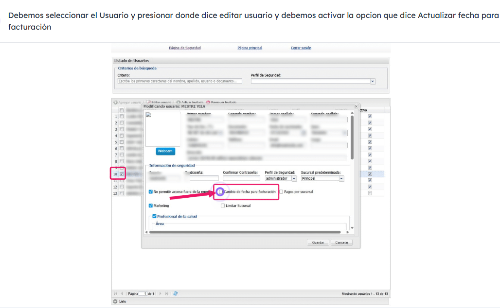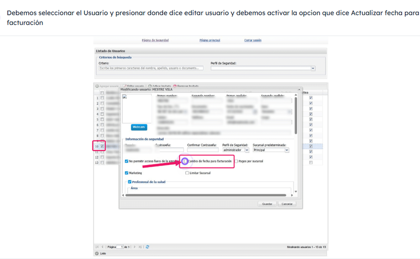 Ruta : Modulo administración/seguridad / usuarios/ selecciona el usuario/ editar usuario/ Activia el permiso: cam biode fecha facturación