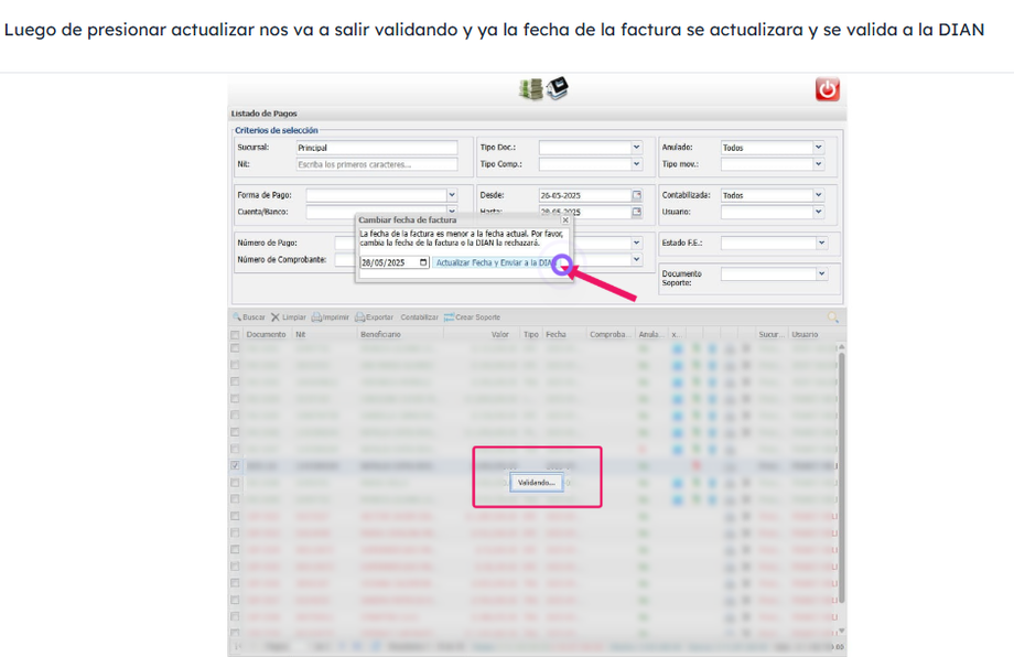 Listo, la factura debe estar validada con la fecha actualizada