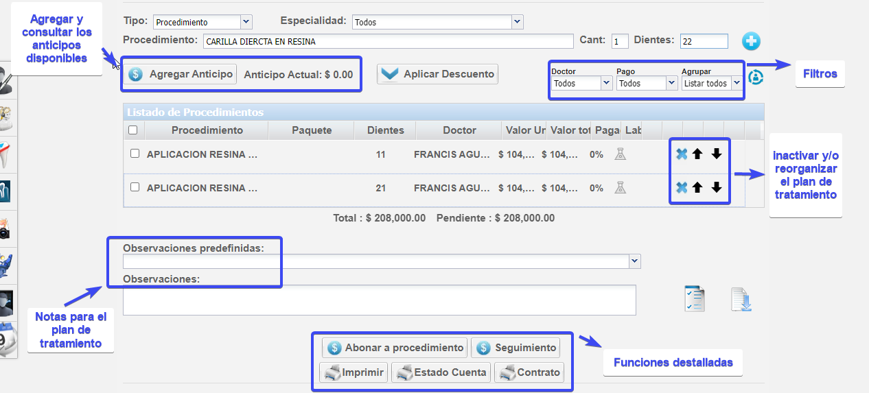 Al ingresar al plan de tratamiento selecionado encuentras los procedimientos y puedes editar y filtrar de diversas formas: Puede agregar nuevos acticipos (botón NUEVO ANTICIPO ) , agregar nuevos procedimentos (PROCEDIMIENTO / AGREGAR) , inactivar procedimientos X AZUL (si no tienes pagos agregados) ,editar los valores unitarios (CLIC EN VALOR UNITARIO), cambiar el doctor tratante del procedimiento (CLIC EN EL NOMBRE DEL DR ) , aplicar los filtros para buscar por pagados y pendientes o por doctor (FILTROS DE LA PARTE SUPERIOR) . agrupar o listar los procedimientos , reorganizar el orden de los procedimientos(FLECHAS NEGRAS)