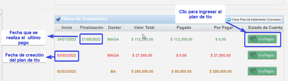 'Al ingresar te ubicas el PLAN DE TRATAMIENTO que necesitas trabajar y das clic en el botón IR A PAGOS (Botón verde al lado derecho ) , eso abre el plan de tratamiento para revisar los procedimientos y los abonos realizados.
