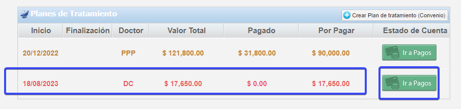 El plan quedara en la parte inferior en colo ROJO listo para facturar , puedes ingresar con el botón IR A PAGOS (Botón de color verde al lado derecho ) ahi encontras todos los procedimientos que dejante organizados en la cotización