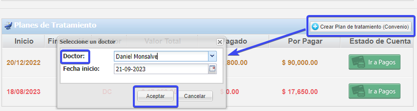 Al ingresar te ubicas en el tercer cuadro y seleccionas CREAR PLAN DE TRATAMIENTO (convenio) , selecionar el doctor tratante y clic en el botón ACEPTAR