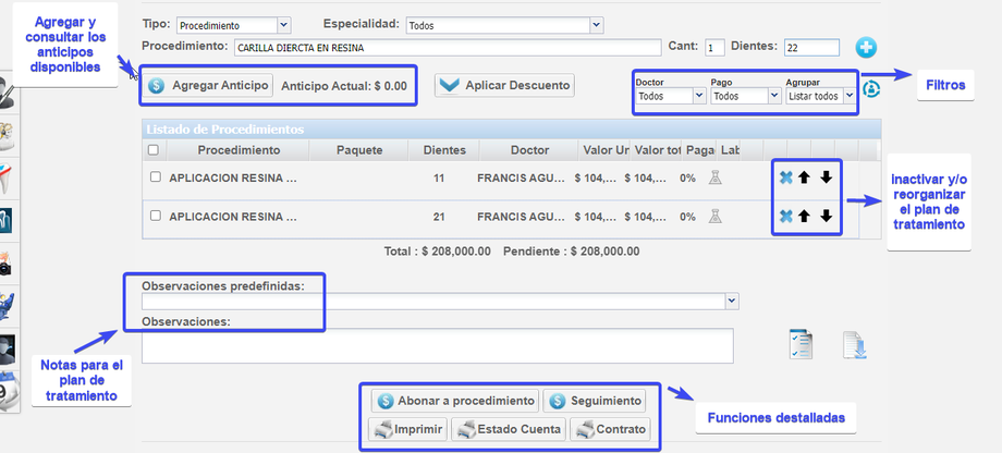 EN LA PARTE INFERIOR PUEDES AGREGAR OBSERVACIONES O NOTAS DETALLADAS , LO PUDES IMPRIMIR , FACTURAR , VER ESTADO DE CUENTA , GENERAR SEGUIMENTOS Y UN CONTRATO POR LOS PROCEDIMENTOS CONTENIDOS